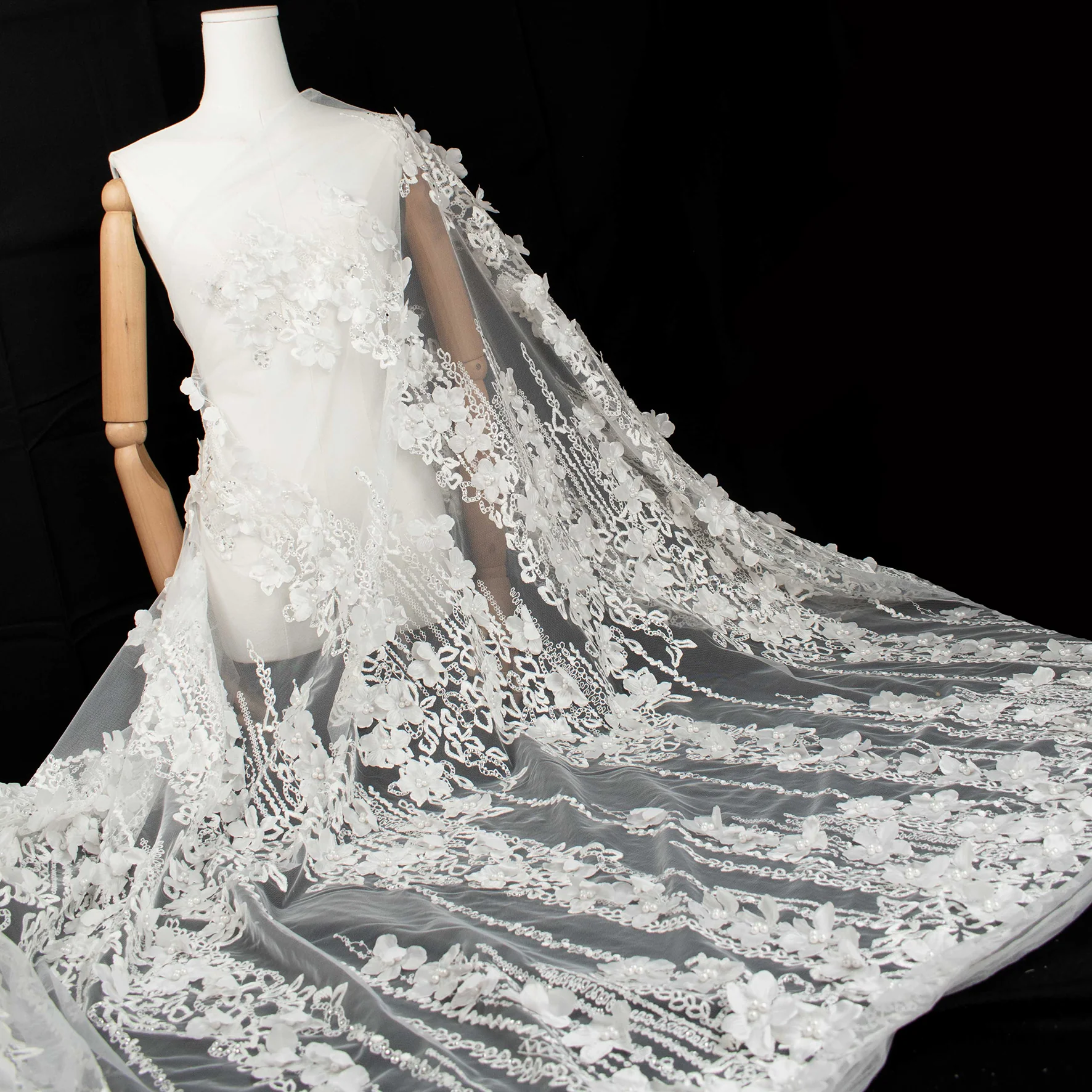 3D Flower Pearl Diamanta Embroidered Lace White Design-8