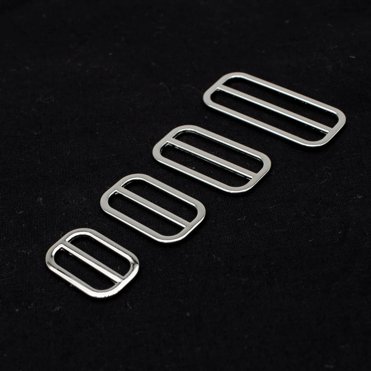 A collection of metal buckles and strap sliders in a variety of sizes, shapes, and colours. Suitable for handbags, belts and other craft projects.